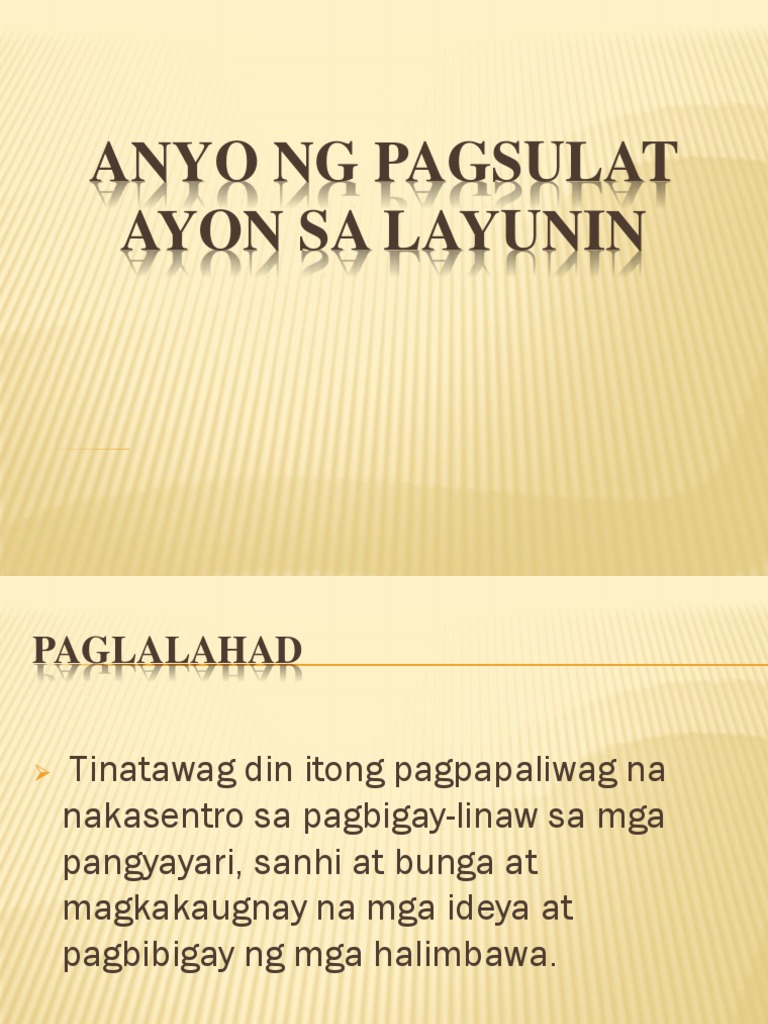 Mga anyo ng pagsulat ayon sa layunin. Ang panitikan ay nagsasabi o nagpapahayag ng mga kaisipan mga damdamin mga karanasan hangarin at diwa ng mga taoAt ito rin ang pinakapayak na paglalarawan lalo na sa pagsulat ng tuwiran o tuluyan at patula. Maaari ding isaalang-alang ang mga bahagi ng teksto. Pagsulat ng talumpati 1.