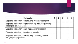Nasusuri ang kalikasan gamit mga kaganapang pinagdaanan at pinagdadaanan ng Wikang Pambansa ng Pilipinas. Komunikasyon Pagbasa at Pananaliksik sa Filipino Unang Edisyon ISBN. Aniya hindi pa.